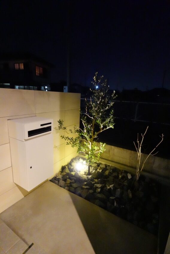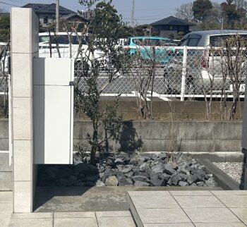 門柱は白をベースとしたタイル(600×300)に宅配ボックスとポストの一体型のものをチョイス。