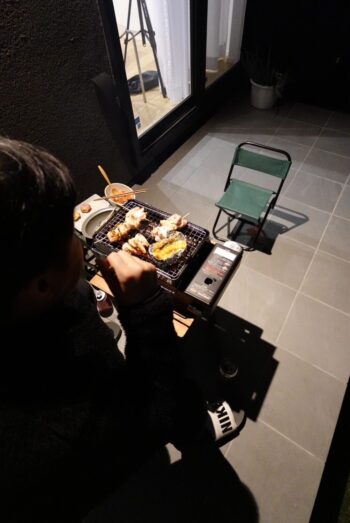 お庭部分にBBQができるようにタイルデッキを造り、人工芝を敷きました。