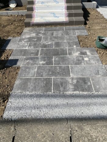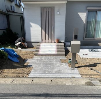 玄関までのアプローチにアクセントをつけるため、黒系のインターロッキングで仕上げます。